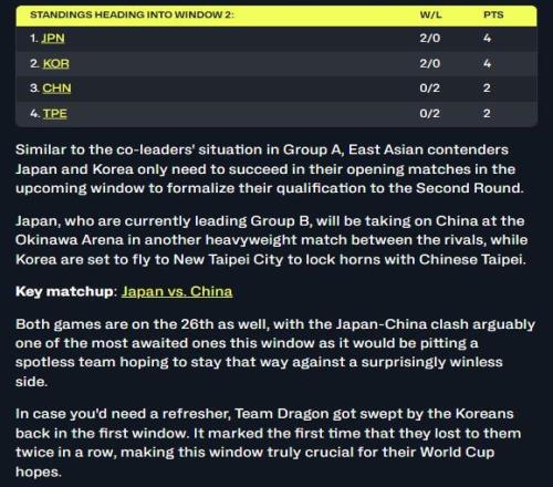 目前暂居 B 组榜首的日本队,将于冲绳竞技场与中国队展开另一场重量级对决。与此同时,韩国队则准备飞抵新北市,与中国台北队一决高下。