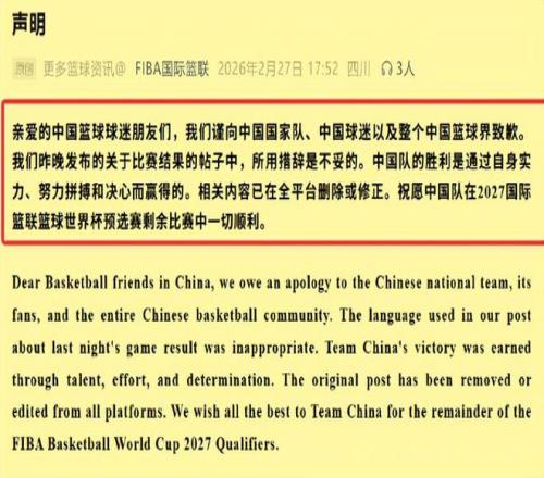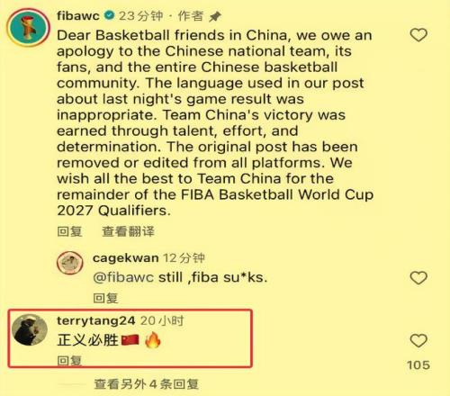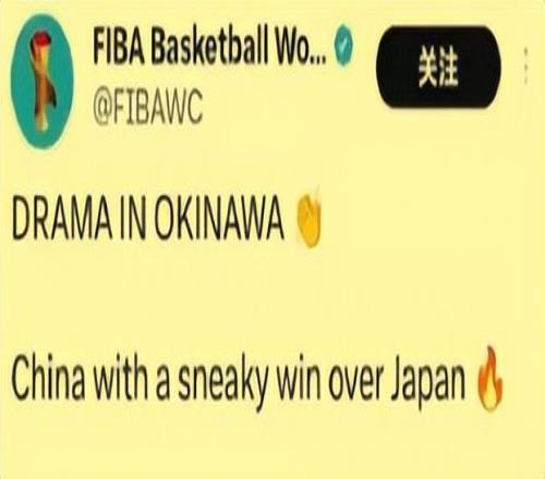 FIBA官方账号发文称中国男篮偷走胜利,国际篮联次日就此公开道歉