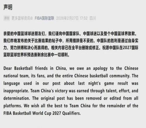 FIBA官方账号发文称中国男篮偷走胜利,国际篮联次日就此公开道歉