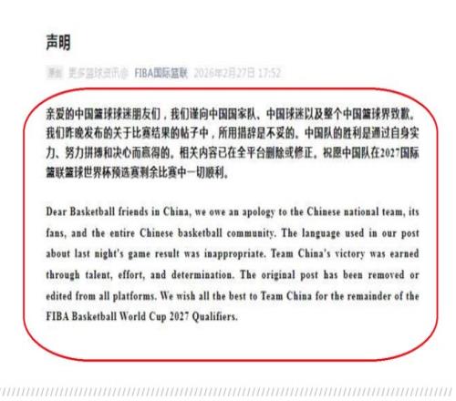 晚上6点!国际篮联正式发布了一份声明:向中国男篮,向中国男篮球迷进行道歉!