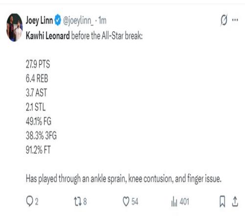 快船官方晒出了决胜一投的海报,末节伦纳德10中6狂砍19分5篮板2助攻2抢断,全场比赛33分钟,20中9,三分5中1,罚球8中8,拿到27分12篮板4助攻4抢断4失误, 命中率45%,三分命中率20%,