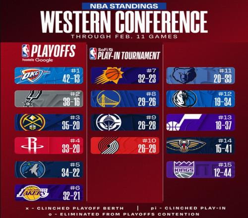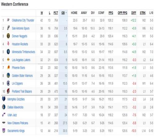 西部已分三档雷霆马刺1档第3至第6仅差2胜场勇士难摆脱附加赛