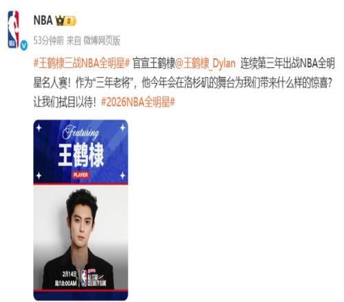 随后NBA官方微博也同步发布了相关消息,官宣王鹤棣连续第三年出战NBA全明星名人赛,并称他为“三年老将”,期待他在洛杉矶舞台上为我们带来惊喜。
