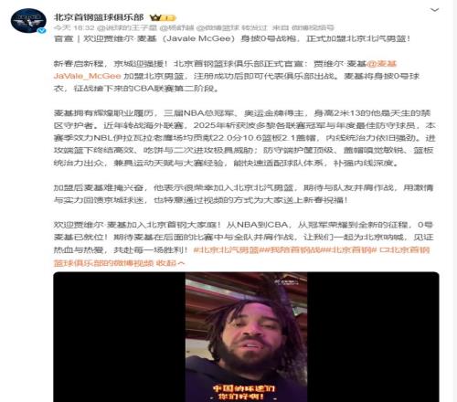 北京时间2月18日,北京首钢男篮刚刚官宣麦基将身披0号球衣为北京男篮出战,他将代表北京队出战CBA第二阶段。从NBA到CBA,从三届NBA总冠军、奥运金牌到CBA全新的征程,麦基将与北京全队一同并肩作战。