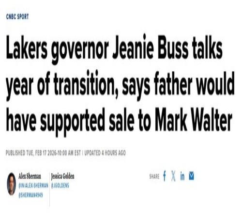 珍妮及其家族去年同意以100亿美元的估值,将湖人队多数股权出售给沃尔特。ESPN近期报道称,巴斯家族兄妹间的严重分歧最终促成了这笔交易,珍妮称这次出售“苦乐参半”。