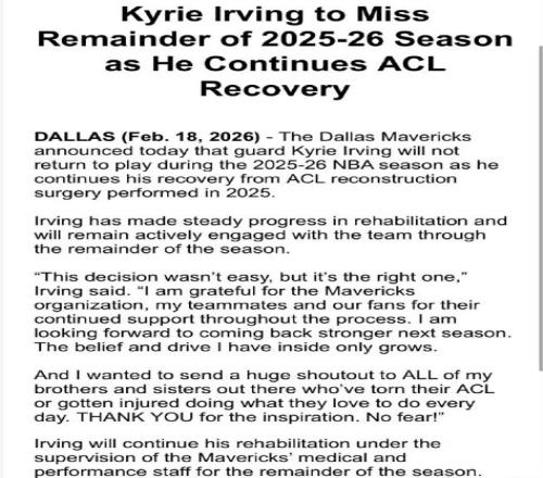 北京时间2月18日,当名记Shams报道表示,欧文本赛季不会复出,随后独行侠官方确认,欧文将于2026-27赛季复出回归赛场。在独行侠交易送走浓眉哥后,本赛季已经确定继续重建,因而欧文复出已经没有意义。