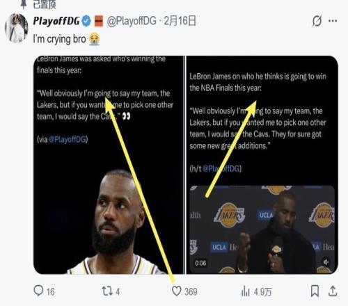 2月20日。有简介是加兰和骑士球迷、账号背景是加兰穿骑士球衣合成图、网名PlayoffDG的用户在社媒平台X上发动态,炫耀他用AI做出历史第一人詹姆斯在接受采访时支持骑士夺冠的虚拟视频戏耍媒体。而他的报道也被一些国内体育网站转载,引发了詹黑集体狂欢,但后者再次遭到打脸。