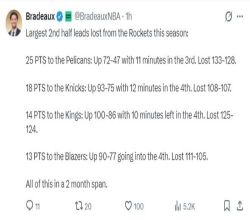 休媒晒出过去两个月内,火箭队已经有四次下半场领先至少13分的情况下被逆转了,最惨烈的一场是下半场领先鹈鹕25分却被逆转了。这场是领先尼克斯18分被逆转。