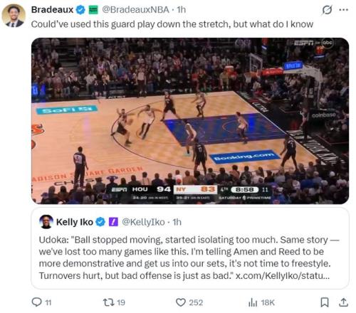 火箭2分惜败尼克斯,而这场比赛火箭一度领先尼克斯达到18分之多,可在末节火箭18中5,命中率仅为27.8%且出现了9次失误,他们帮助尼克斯打出33-15的攻防浪潮,尤其是最后5分钟关键时刻球队是接连出现低级的失误,这场比赛引发了全美热议。