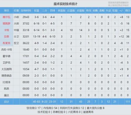 伦纳德出战33分钟,25投14中,三分7中2,罚球9中7,砍下37分8板4助3断2帽!马瑟林替补出战30分钟,16中7拿下21分8板5助。贝恩19投13中,拿到36分5板1助2断,正负值+12。班凯罗16分7板8助、小卡特15分14板。