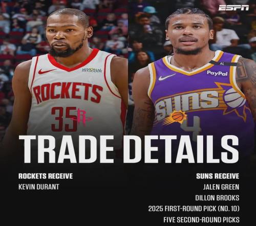 杰伦-格林出生于2002年2月9日,2021年的NBA榜眼秀,他跟库明加一样都是点燃队出身。2025年夏天,火箭送出狄龙-布鲁克斯、杰伦-格林、2025年首轮10号签(马鲁阿奇),以及5个次轮签,8换1交易得到杜兰特!