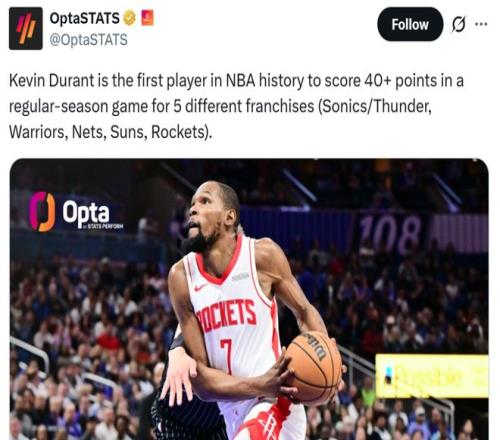 37岁151天的杜兰特轰下40+得分也让其成为火箭队史单场砍下40+最老的球员,同时这是其火箭生涯第一次40+,让杜兰特成为NBA历史上首位在5支不同球队常规赛都拿到过40+得分的球员。