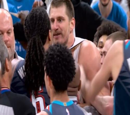 雷霆球员杰林冲上去帮队友多尔特出头,他与约基奇推搡互相撕扯球衣,双方多位球员围拢在一起爆发冲突。