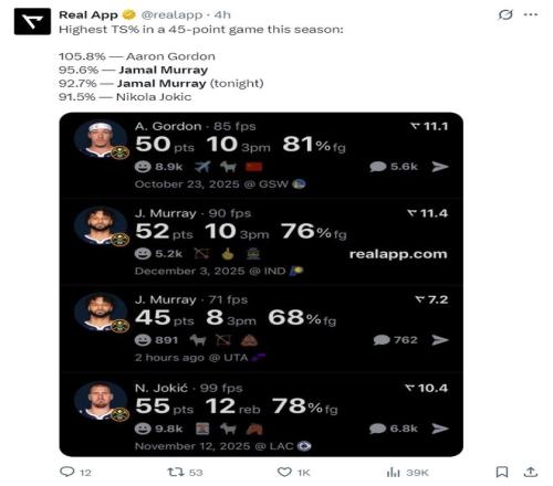 3.掘金本赛季拿到45分以上真实命中率超过90%的球员有三人:约基奇、穆雷(2次)、戈登;