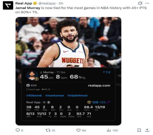 2.穆雷此役拿到第三次45+真实命中率90%与哈登、欧文、库里并列历史第一;