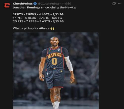 反观与铂金互换东家的库明加,在老鹰混得那叫一个风生水起,目前出战三场比赛全部取胜,场均能够贡献21.3分7.7板3.3助1.7断,投篮命中率高达67.7%,三分命中率达到55.6%,直接打成了全明星前锋水平。