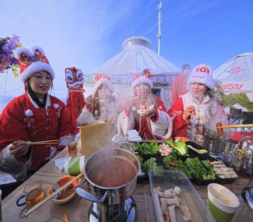 2025年12月20日,新疆昌吉,游客在昌吉回族自治州昌吉市努尔加滑雪场品尝雪地火锅。视觉中国 图