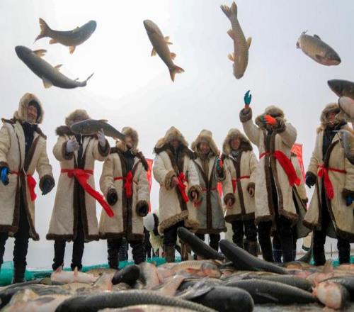 1月18日,渔民在博湖县博斯腾湖冰面上进行冬捕作业。这次巨网冬捕活动,吸引各地游客前来观赏。 新华社 图