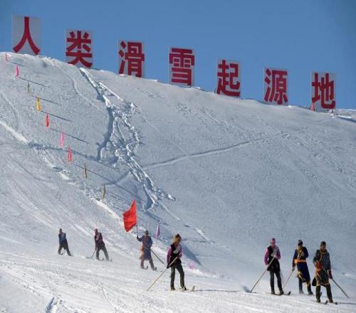 2011年2月,新疆阿勒泰市将军山滑雪场,当地农牧民脚蹬古老毛皮雪板从山坡上滑下。中国新疆阿勒泰是人类滑雪最早的起源地。2007年1月16日,阿勒泰市荣获“人类滑雪最早起源地”吉尼斯世界纪录。中新社记者 刘新 摄