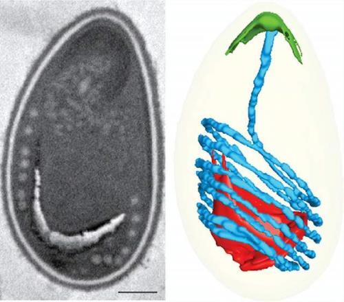 寄生虫Anncaliia algerae的孢子(左侧显微照片)内部紧密盘绕着一根如鱼叉般的细管(右侧示意图)。时机一到,孢子便会“发射”出这根细管以刺穿宿主细胞。图片来源: R. CHANG 等人 / ELIFE 2024