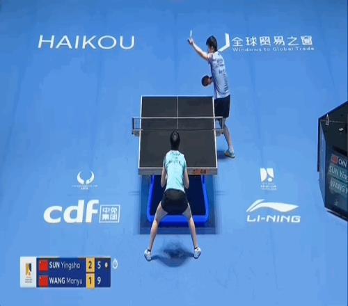 9-7之后,孙颖莎发球,王曼昱接发抢攻,孙颖莎正手反拉斜线得分。局点,王曼昱网前失误,孙颖莎大比分3-2领先。