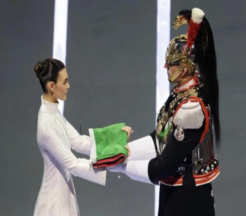 人群尽头,女护旗手缓步走来,郑重将国旗交予升旗手。在女歌手深情的吟唱中,意大利国旗缓缓升起,庄严而动人。
