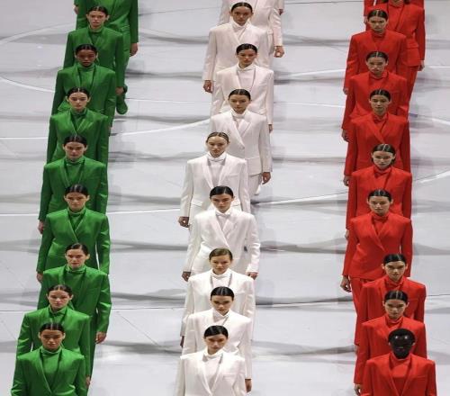 意大利国旗入场之际,全女超模列队身着红、白、绿三色西服入场,以色彩勾勒出意大利国旗。以优雅又极具格调的方式,尽情展现着米兰独特的时尚浪漫与艺术风采。