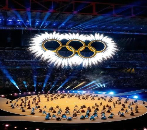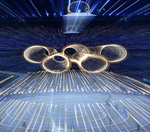 光影流转,乐声悠扬,舞者自环中翩然飞出,轻落大地。点点圆环不断汇聚、相拥,在光影与旋律里缓缓成形,奥林匹克五环灿然绽放,自然与都市、冰雪与文明,于此相拥。
