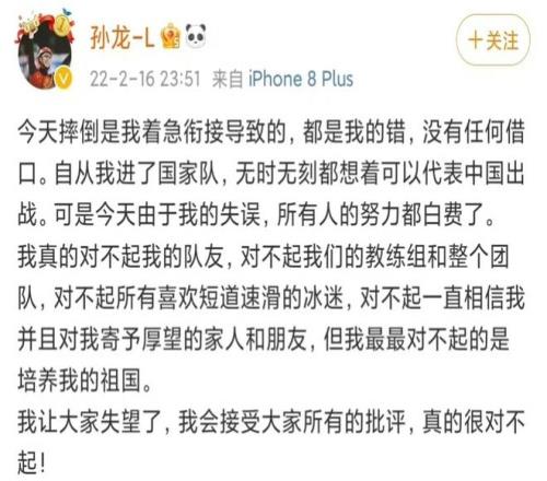 赛后,孙龙泪洒赛场,在个人社交媒体上连用六个"对不起"向国家和队友致歉。这次失误让他陷入了职业生涯的低谷——经验欠缺、心态不沉稳、外界的质疑声铺天盖地而来......