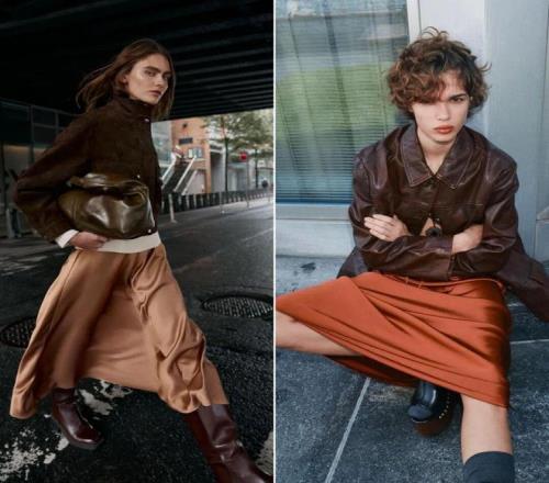 之前也聊过,帅气利落的麂皮/皮革夹克,能很好地化解缎面裙的隆重感。而且,“橙+棕”本来就是相近色,组合起来很像落日余晖。