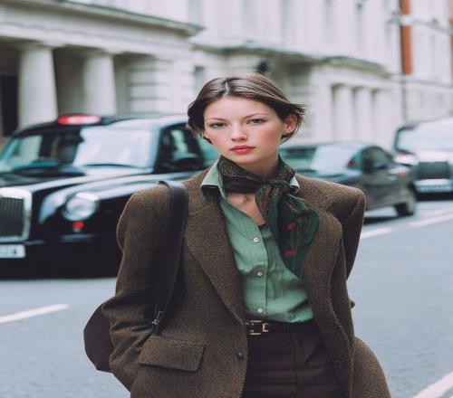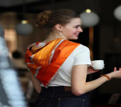 如果想要更低调/更好驾驭的组合,可以试试橙色丝巾,搭配棕色皮革小单品,比如皮手表、皮包。