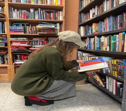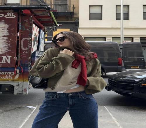 下装推荐牛仔裤,能很好地承接上身的红绿撞色。▼