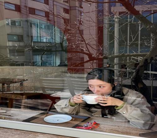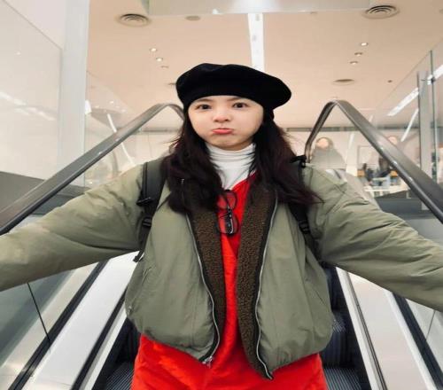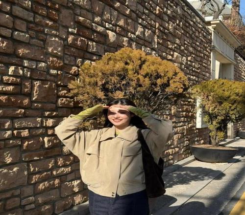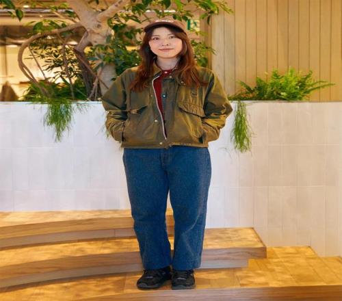 像郑采妍一样在卡其棕外套袖口,露出一截绿色袖子。▼