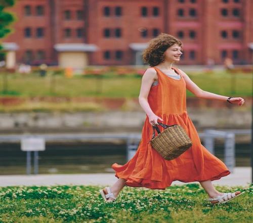 橙色缎面裙+棕色包包,也是同一个逻辑。 ▼