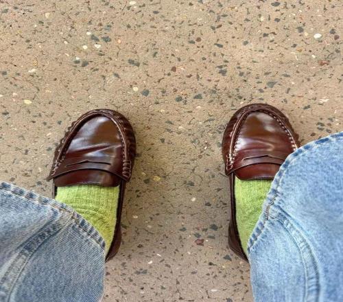 不想大面积穿绿棕配的朋友,也可以试试绿色袜子+棕色乐福鞋。▼