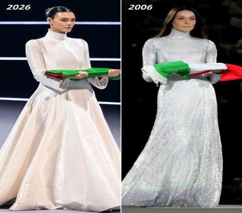 “小李子女友”超模Vittoria Ceretti手捧国旗入场(左),造型致敬了20年前同样担任护旗手的超模Carla Bruni(右),两人都身着阿玛尼高定(Armani Privé)。▼