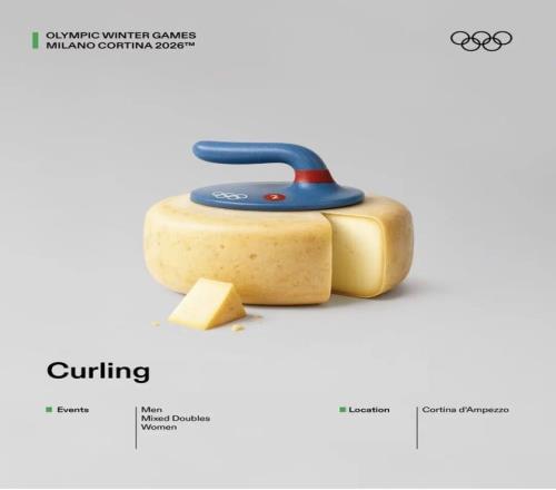 意大利冬奥会的海报设计的黄蓝配——“奶酪冰壶”。▼