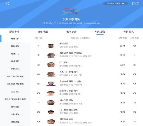目前的沙特联射手榜上,伊万·托尼以24球领跑,C罗21球暂居第3。
