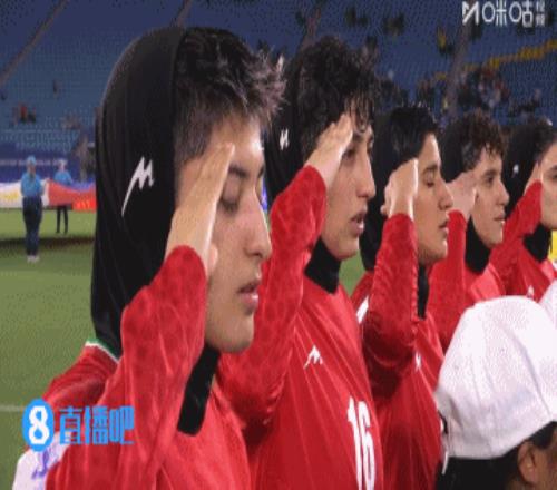 赛前奏国歌环节,伊朗女足都敬着军礼唱国歌。↓
