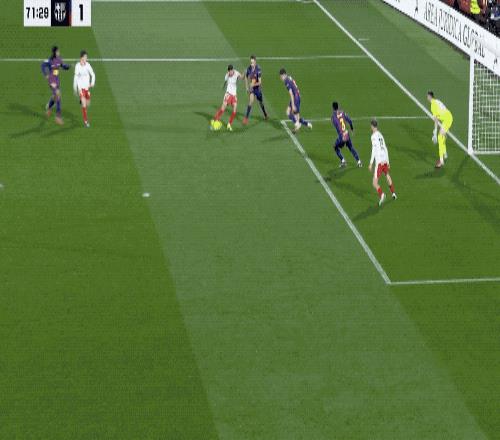 第58分钟,亚马尔将球传到后点,拉菲尼亚的射门打在林孔的头上出了底线。