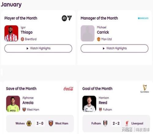 上述三项评选中,曼联方面均获得提名,可是多古(2项)、库尼亚和拉门斯悉数落选,只有1月最佳主教练,由两连胜的卡里克当选。其余候选名单,包括3连胜的罗塞尼尔,2胜1平1负的戴奇,3胜1平1负的伊劳拉等四名主帅。