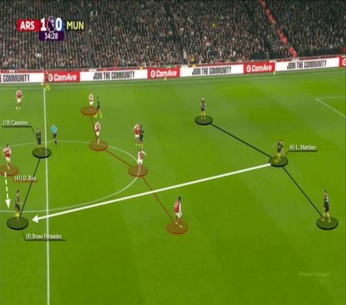 曼联的主要套路还是二打二的配合,像3-2击败阿森纳之战,B费和多古就这样突破中路,攻入了球队的第二球。