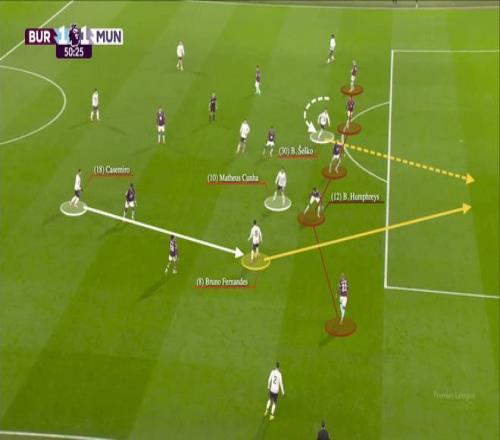 在这一区域的直塞球,他仅次于阿森纳的马丁·厄德高排名第二,同时,只有利物浦的萨拉赫在这个区域创造了更多的绝佳机会。B费就在这个位置斜传谢什科,帮助曼联1-0领先伯恩利。