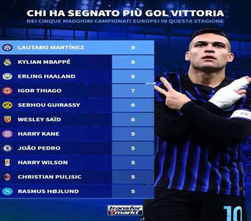 本赛季五大联赛制胜球进球榜:劳塔罗、姆巴佩、哈兰德前三