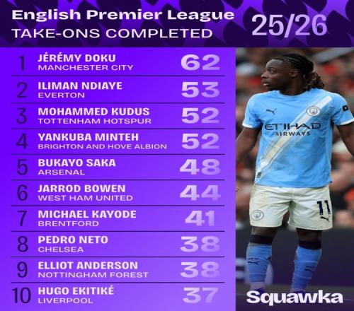 埃弗顿的恩迪亚耶以53次排在第二位,热刺的库杜斯和布莱顿的明特以52次过人分列三四位。