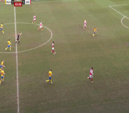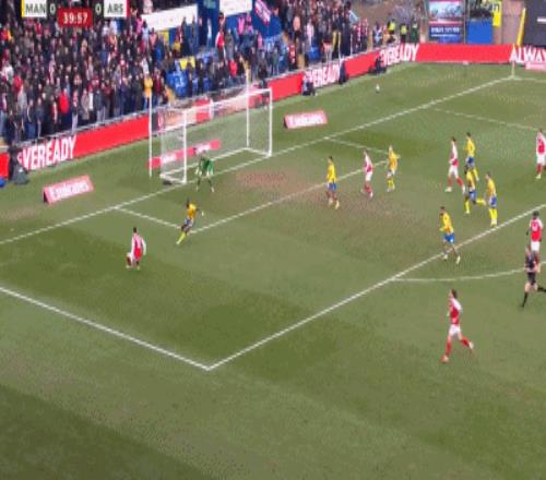 第64分钟,阿森纳打出边中结合,可惜门前近在咫尺的打门,被曼斯菲尔德球员诺勒门线解围。